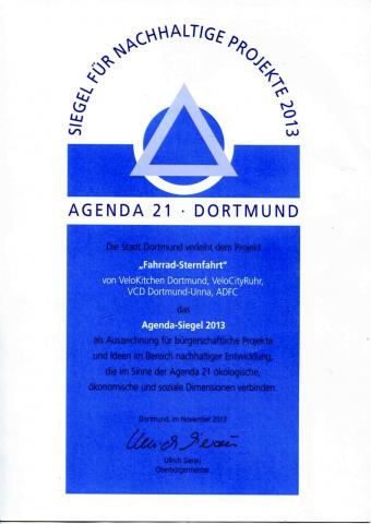 Die Auszeichnung bekam das Projekt "Fahrradsternfahrt" von ADFC, VCD, Velokitchen Dortmund und VeloCityRuhr für "bürgerschaftliche Projekte und Ideen im Bereich nachhaltiger Entwicklung, die im Sinne der Agenda 21 ökologische, ökonomische und soziale Dimensionen verbindet."