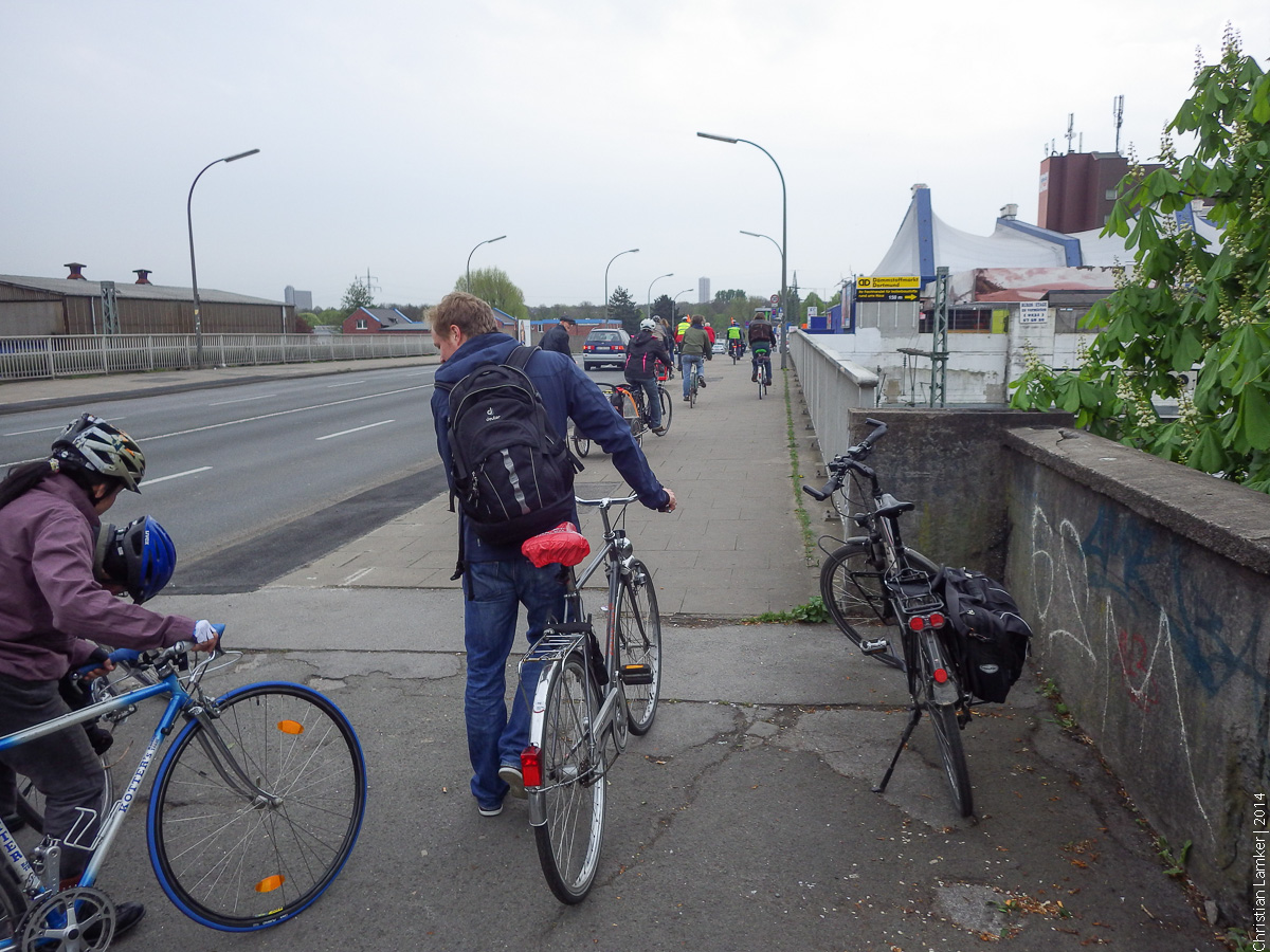 25. Fußgängerbrücke über Rheinlanddamm.: gefährliche Auf- und Auffahrten auf der Südseite der B1; Lösung ist durch Radschnellweg hier möglich